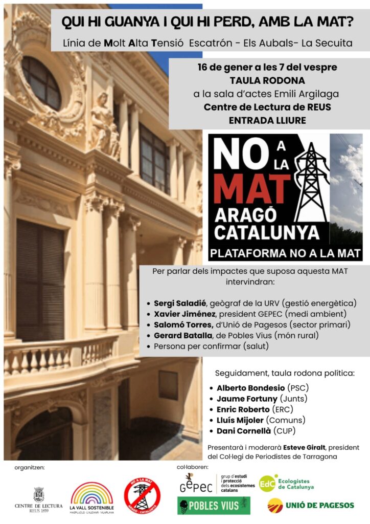 El proper divendres 16 de gener de 7 a 9 del vespre, al Centre de Lectura de Reus, s’organitza la taula rodona “Qui hi guanya i qui hi perd, amb la MAT?”, un espai de debat obert per analitzar les repercussions de les línies de Molt Alta Tensió (MAT) i, en especial, del projecte Escatrón–Els Aubals–La Secuita, que comptarà amb membres d’entitats i polítics.